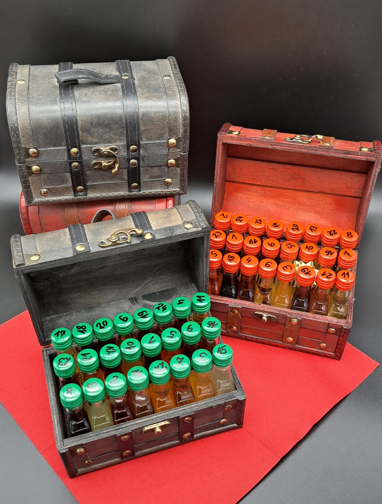 - Adventkalender für Erwachsene - "Schatzkiste" besteht aus 24 verschiedenen Likören in einer Holztruhe
